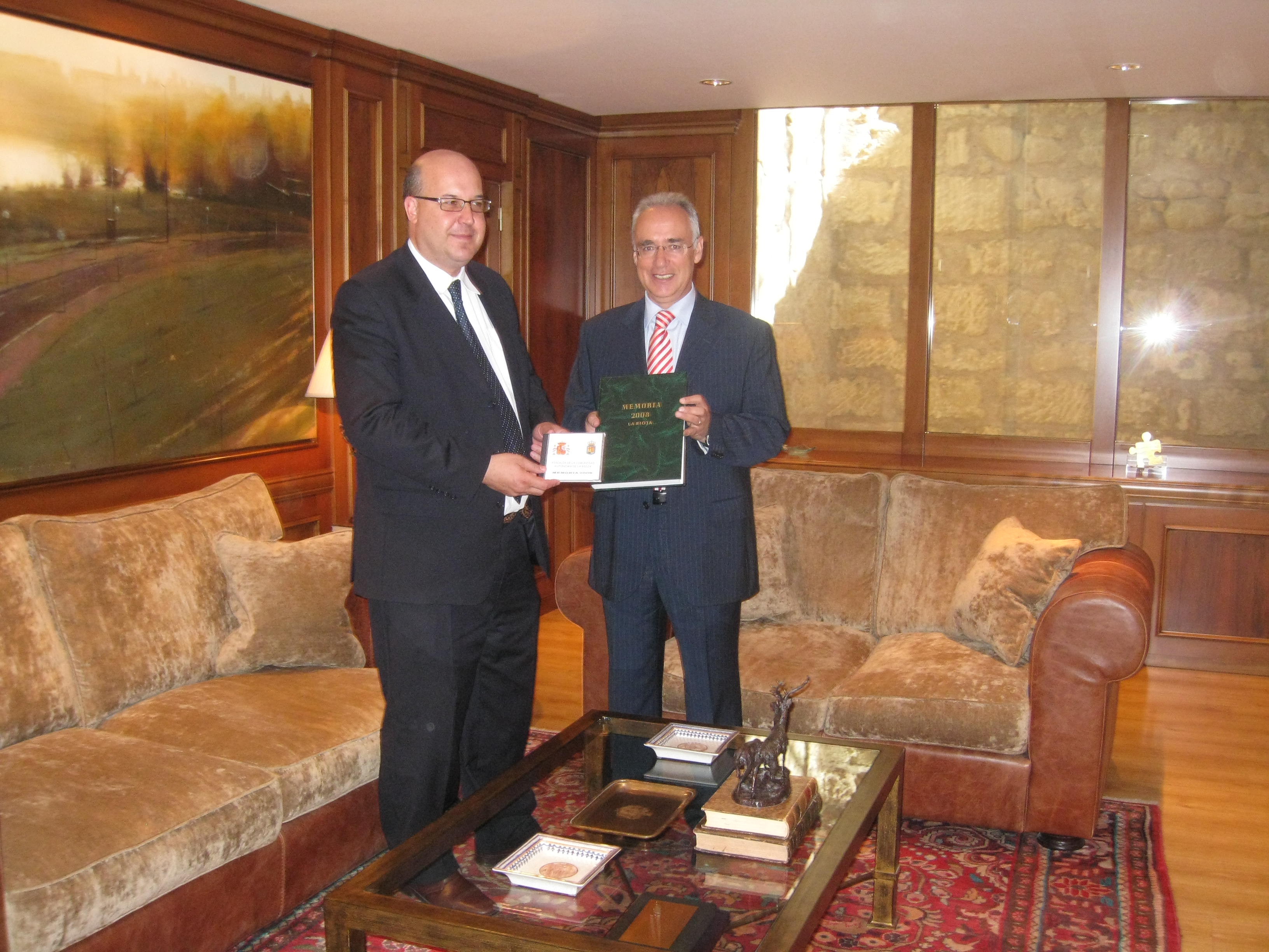 El Presidente del Parlamento de La Rioja, José Ignacio Ceniceros González, ha recibido esta mañana al Fiscal Superior de la Comunidad Autónoma de La Rioja, Juan Calparsoro Damián, que le ha hecho entrega de la Memoria de la Fiscalía correspondiente al ejercicio 2008.