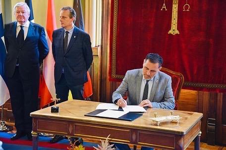 El Presidente del Parlamento firmando la nueva declaración institucional