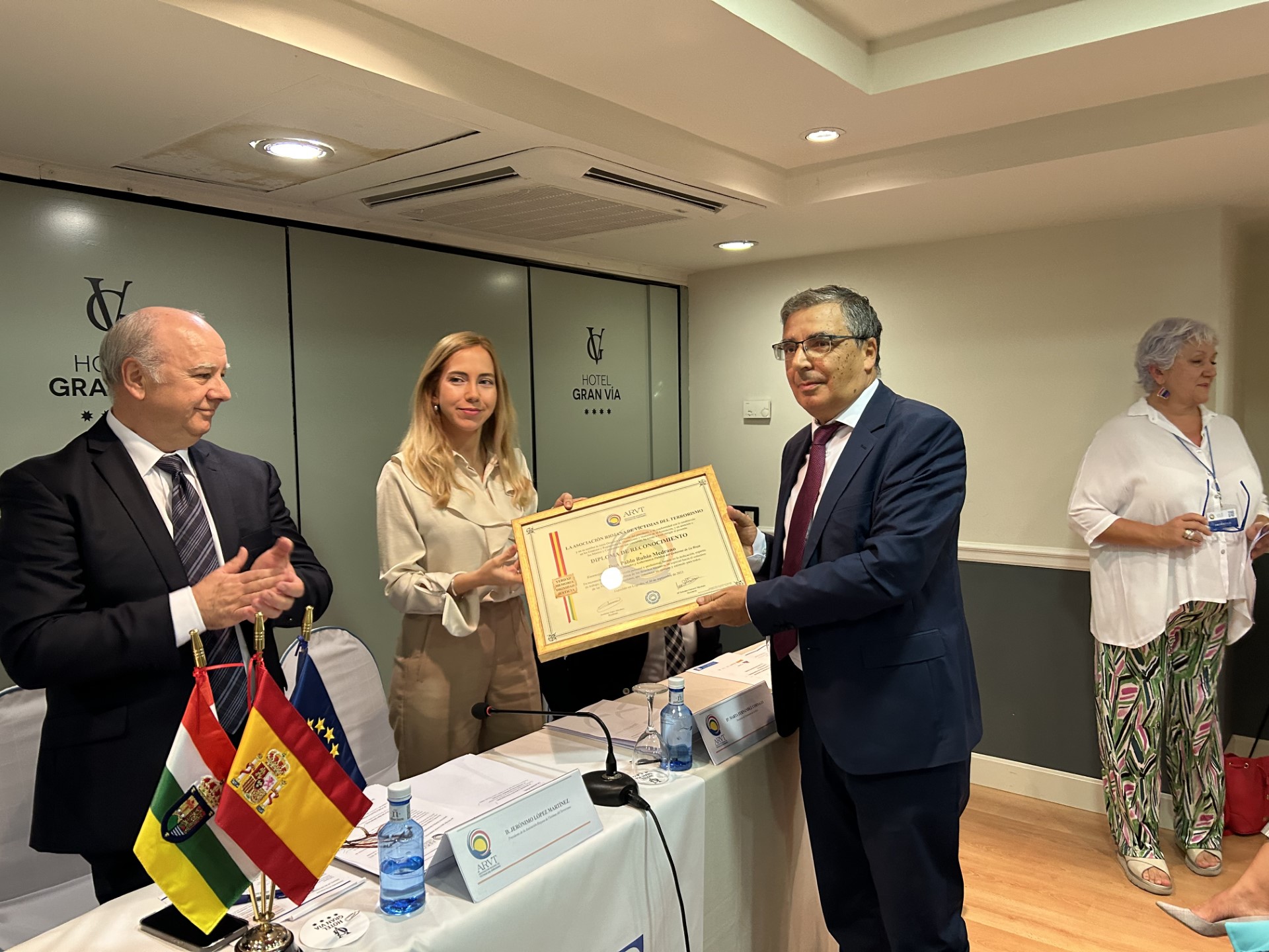 Asimismo, la ARVT ha entregado la distinción al mérito de la protección y defensa a las víctimas del terrorismo a: Javier Navalmoral, comisario principal jefe de la Unidad Central TEDAX-NRBQ; al exconsejero de Servicios Sociales y Gobernanza Pública del Gobieno de La Rioja, Pablo Rubio; y al exdiputado y portavoz del Grupo Parlamentario Ciudadanos en el Parlamento de La Rioja Pablo Baena.