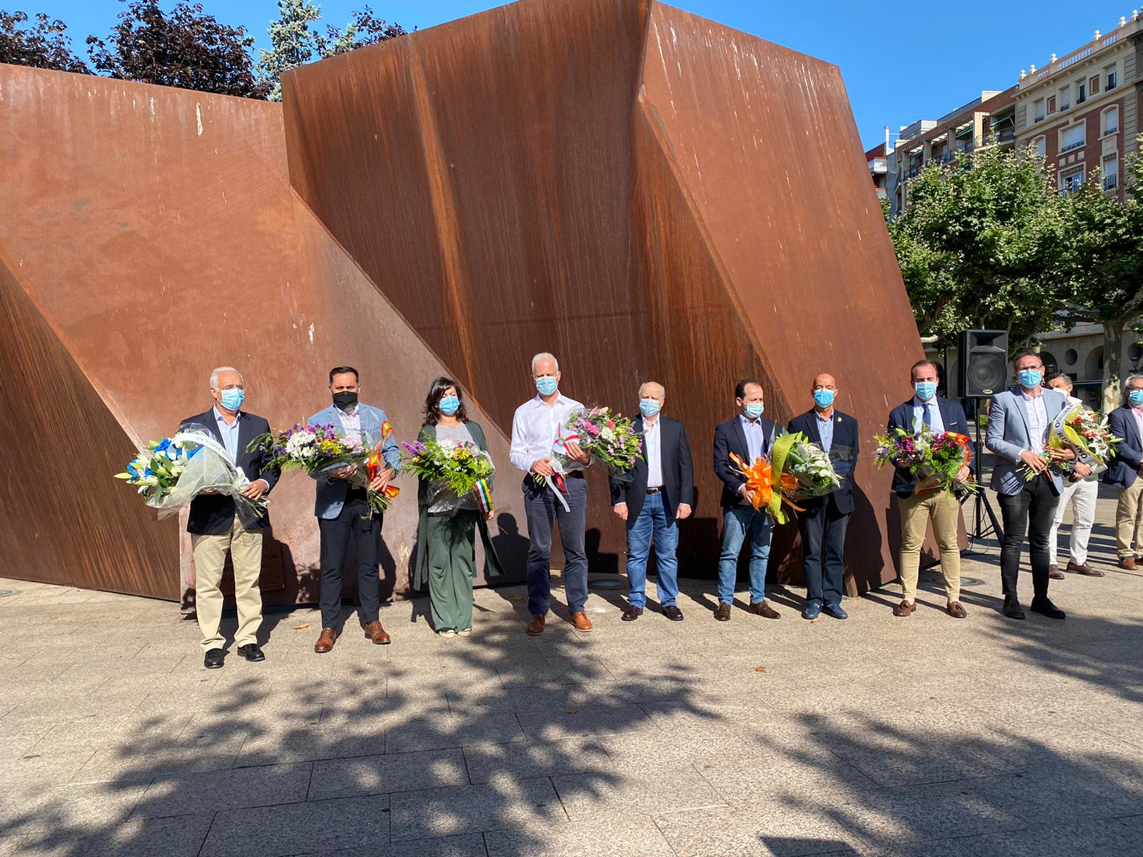Autoridades civiles haciendo ofrenda de flores en el Monumento Víctimas del Terrorismo del Paseo del Espolón