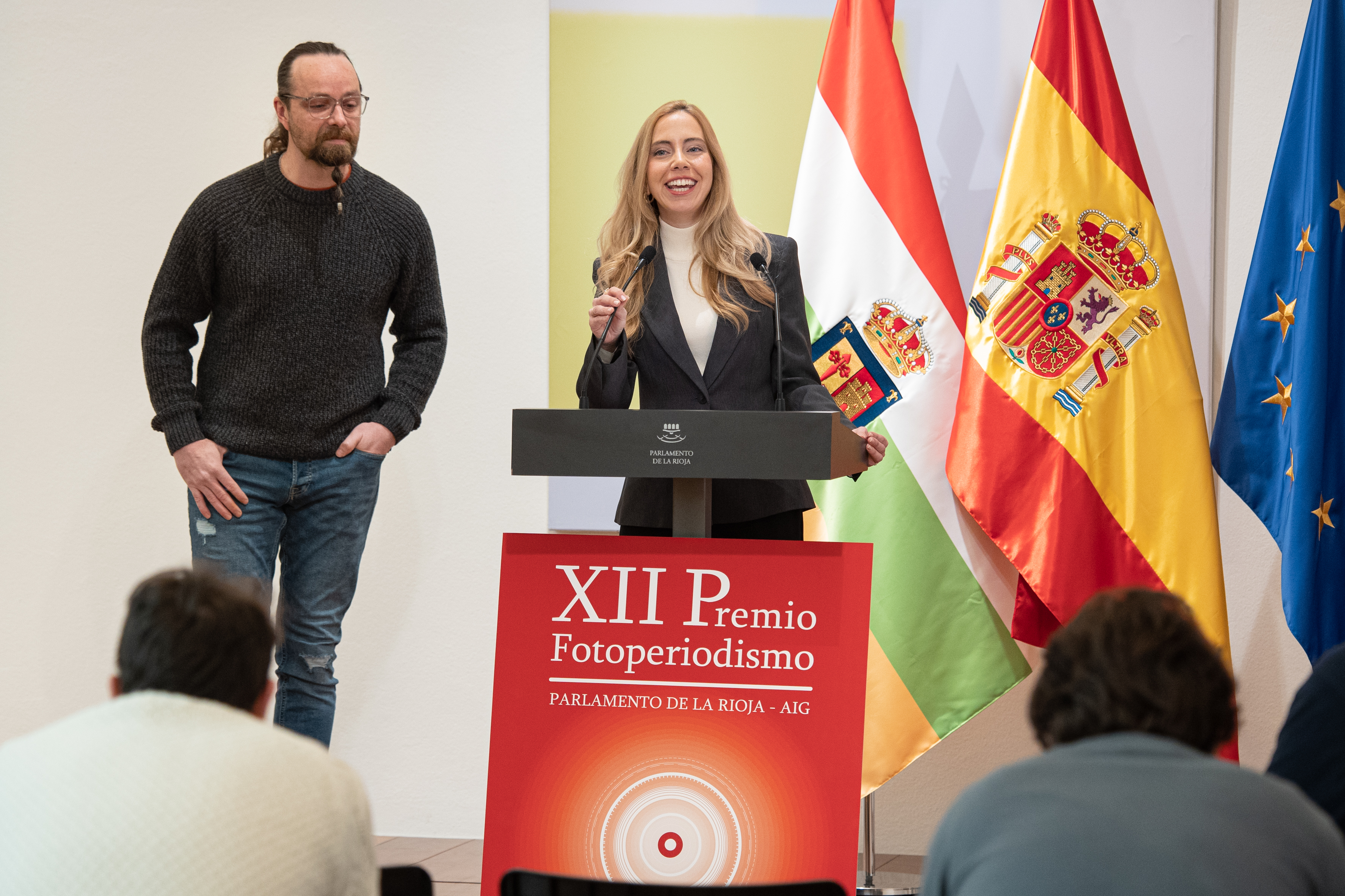 La presidenta del Parlamento de La Rioja, Marta Fernández Cornago, y el presidente de la Asociación de Informadores Gráficos de Prensa y Televisión de La Rioja (AiG), Óscar Solórzano, han presentado hoy la duodécima edición del Premio de Fotoperiodismo. Una iniciativa impulsada por la Cámara regional con la colaboración de AiG con el objetivo de reconocer y difundir la labor de los profesionales del fotoperiodismo en La Rioja.
